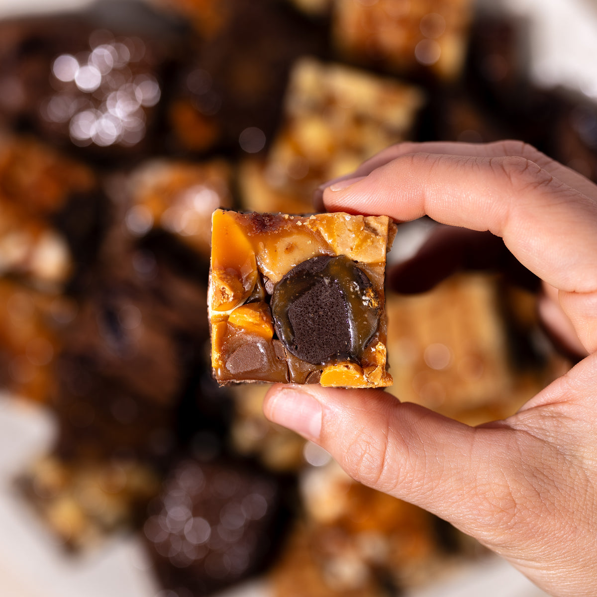 INGREDIENTS: Premium Gold Semi-Sweet Chocolate Drops (Sugar, Chocolate Liquor, Cocoa Butter, Soy Lecithin [an emulsifier]), Sugar, Artisan White Flour (Wheat Flour, Malted Barley Flour, Niacin, Reduced Iron, Thiamine Mononitrate, Riboflavin, Folic Acid), Caramel (Corn Syrup, Sugar, Milk, Water, Fructose, Hydrogenated Coconut Oil, Butter (Cream [Milk], Salt), Mono- and Diglycerides, Salt, Soy Lecithin, Vanillin), Liquid Whole Eggs, Salted Butter (Cream, Salt), White Wafers (Sugar, Vegetable Oil [Palm Kernel Oil and Hydrogenated Palm Kernel Oil], Whole Milk Solids, Whey Powder, Nonfat Dry Milk Solids, Artificial Color [Titanium Dioxide], Soy Lecithin [An Emulsifier], Salt, Artificial Flavor), Dark Wafers (Sugar, Vegetable Oil [Palm Kernel Oil and Hydrogenated Palm Kernel Oil], Cocoa Powder [Processed With Alkali], Soy Lecithin [An Emulsifier], Whey Powder [Milk], Salt), Milk Wafers (Sugar, Vegetable Oil [Palm Kernel Oil and Hydrogenated Palm Kernel Oil], Cocoa Powder, Nonfat Dry Milk Solids, Whole Milk Solids, Whey Powder, Soy Lecithin [An Emulsifier], Salt, Artificial Flavor), Peanut Wafers (Sugar, Vegetable Oil (Palm Kernel Oil and Hydrogenated Palm Kernel Oil], Partially Defatted Peanut Flour, Whey Powder [Milk], Soy Lecithin [An Emulsifier], Salt), Milk, Toffee (Sugar, Vegetable Oil [Palm Oil, Sunflower Oil] Dairy Butter [Milk], Almonds, Contains 2% or Less of Salt, Lecithin [Soy], Chocolate), Butterscotch Chips (Sugar, Palm Kernel and Palm Oil, Whey, Nonfat Milk, Natural Flavor, Added Color, Sunflower Lecithin, Vanilla), Pure Vanilla Extract (Water, Alcohol, Sugar, Vanilla Bean Extractives [Madagascar]), Baking Powder (Sodium Bicarbonate, Monocalcium Phosphate, Sodium Acid Pyrophosphate).